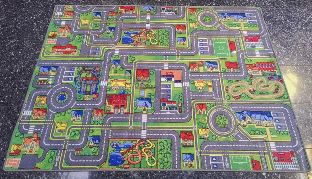 Dětský kusový koberec PlayCity v rozměru 95 x 200cm, 140 x 200cm a 165 x 200cm, je nízky smyčkový koberec na ultratexovém (filc) podkladu, vyroben z materiálu 100% Polyamid a dětským potiskem silnic a různých budov který je určen pro hraní s autíčky.