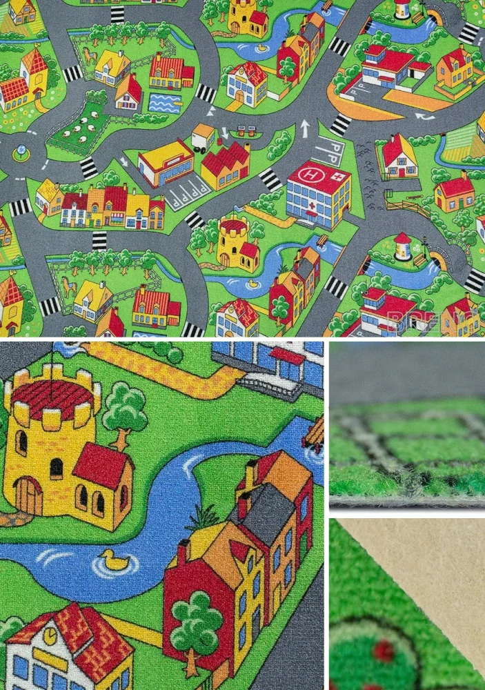 Dětský metrážový koberec Little village s motivem silnic se těší oblibě nejen u detí. Koberec s vesničkou se silnicemi v příjemných barvách, zelené plochy a šedé silnice jsou doplněny o barevné domy, řeku, zvířata, ovečky, stromy, hrady a majáky, je do dětského pokojíku jako stvořený. Je vyroben ze 100% polyamidu na filcovém podkladu. Výška koberce je 6,5mm, výška samotného vlasu je 3mm a jeho hustota je 155000 bodů/m²