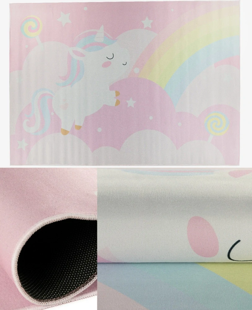 Dětský kusový koberec Jednorožec s duhou v jemných pastelových barvách si oblíbí snad každá holčička, je vyroben z kvalitního materiálu 100% Polyesteru na protiskluzovém podkladu, který zajistí bezpečnost dětí při hře.