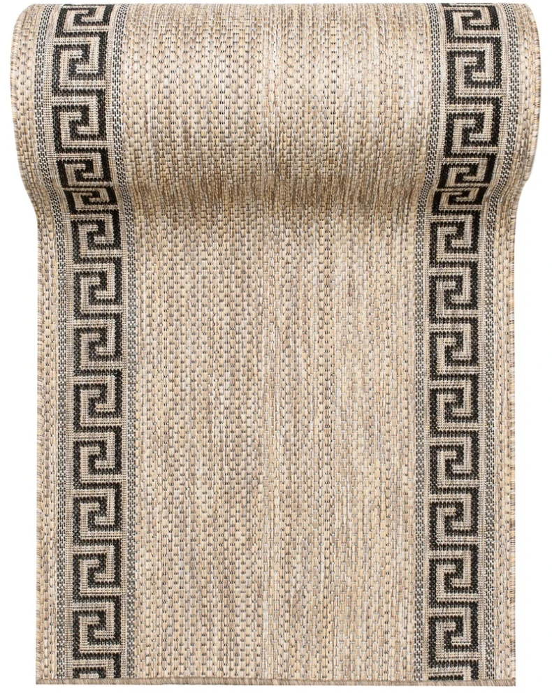 Buklé běhouny KF91A hnědé a šedé barvy s bordúrou gréckeho stylu po délce běhounů jsou dostupné v šířích 60cm, 70cm, 80cm a 100cm. Metrážový běhoun Buklák KF-91A je vyroben z materiálu 100% Polypropylén s výškou 6mm a hmotností 1400g/m2.