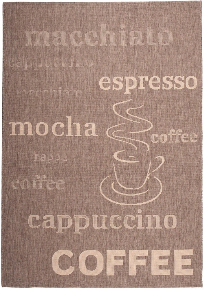 Buklé kusové koberce 20220 Coffee hnědé a šedé barvy s kavárenským motivem (coffee, cappuccino, macchiato, espresso) jsou dostupné v rozměru 200 x 290cm. Buklák 20220 je vyroben z materiálu 100% Polypropylén s výškou 6mm a hmotností 1400g/m2.