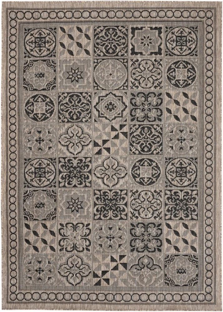 Buklé kusové koberce KF-87A hnědé a šedé barvy se španělským vzorem a jemnou řetízkovou bordúrou po obvodu koberce, jsou dostupné v rozměrech od 60 x 100cm do 240 x 330cm a také jako metrážové běhouny a kruhové koberce ve stejné barvě a se stejným španělským vzorem. Buklák KF-87A je vyroben z materiálu 100% Polypropylén s výškou 6mm a hmotností 1400g/m2.