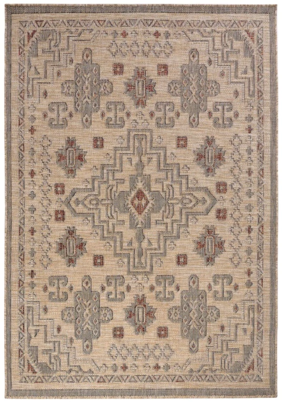 Buklé kusové koberce KV38AB béžové a hnědé barvy jsou dostupné v rozměrech do 200 x 300cm. Buklák KV38A s indiánským vzorem je vyroben z materiálu 100% Polypropylén s výškou 6mm a hmotností 1400g/m2.